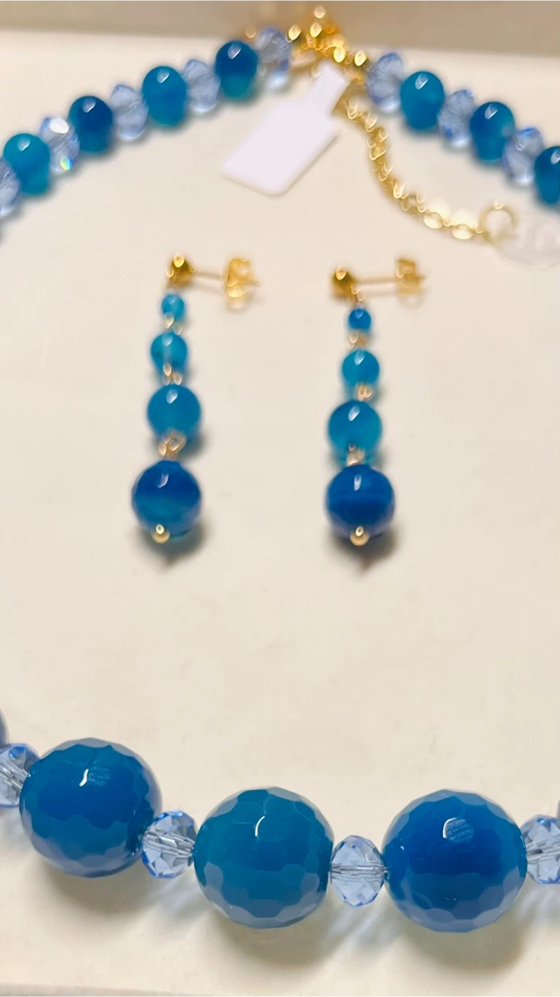 Beautiful matching necklace and earring set in various shades of blue! The necklace features large, faceted beads and smaller crystal-like accents, while the earrings have a simple, elegant drop design with multiple beads. Perfect for adding a pop of colour to any outfit