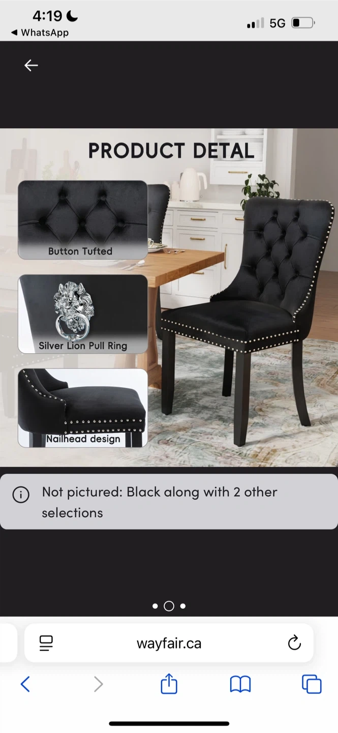 137Wayfare Price $140 Each Selling a stylish black dining chair! It features a button-tufted design and nailhead trim. The chair also has a silver lion pull ring detail on the back. Perfect for adding a touch of elegance to your dining space