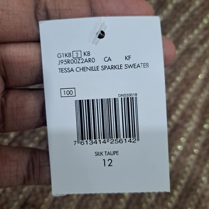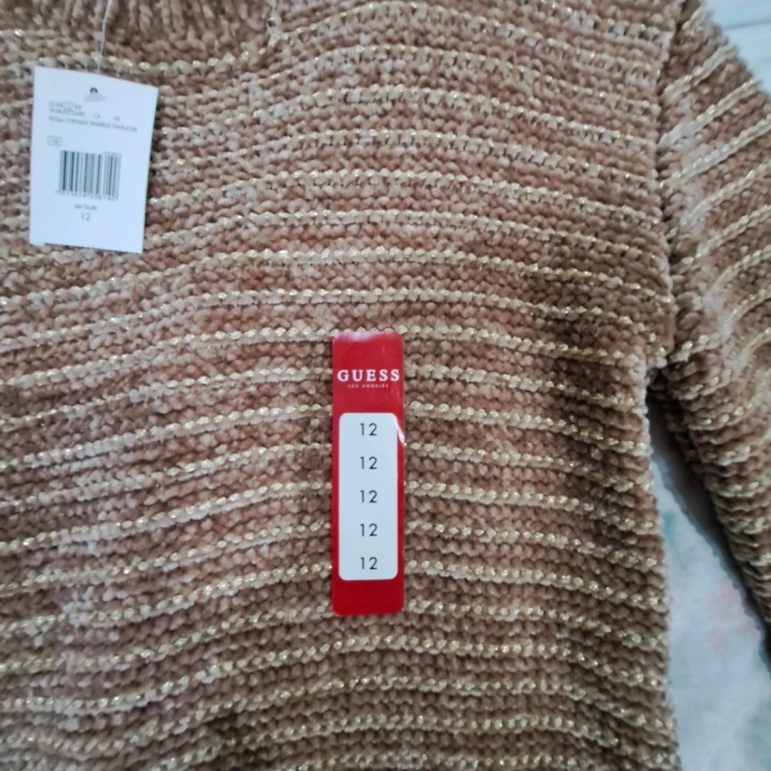 This Guess sweater is new with tags and ready to add a touch of sparkle to your little one's wardrobe! Featuring a light brown base with subtle gold threading, this size 12 girl's sweater is both stylish and cosy.