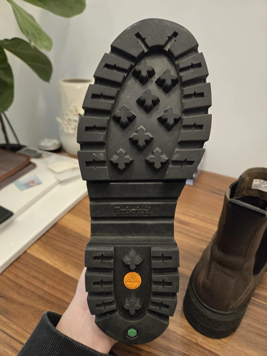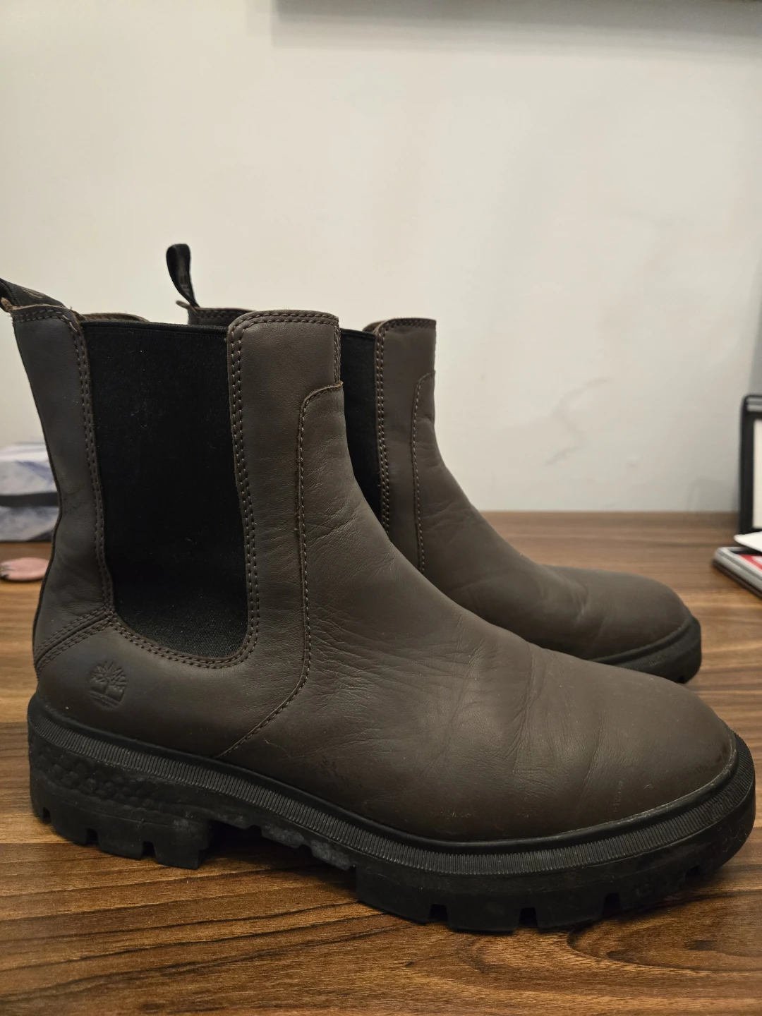Selling a pair of Timberland Chelsea boots in women's size 8.5. They are in good condition and have a stylish, versatile look. The boots feature Timberland's GreenStride™ technology for comfort and durability. Waterproof and weatherproof