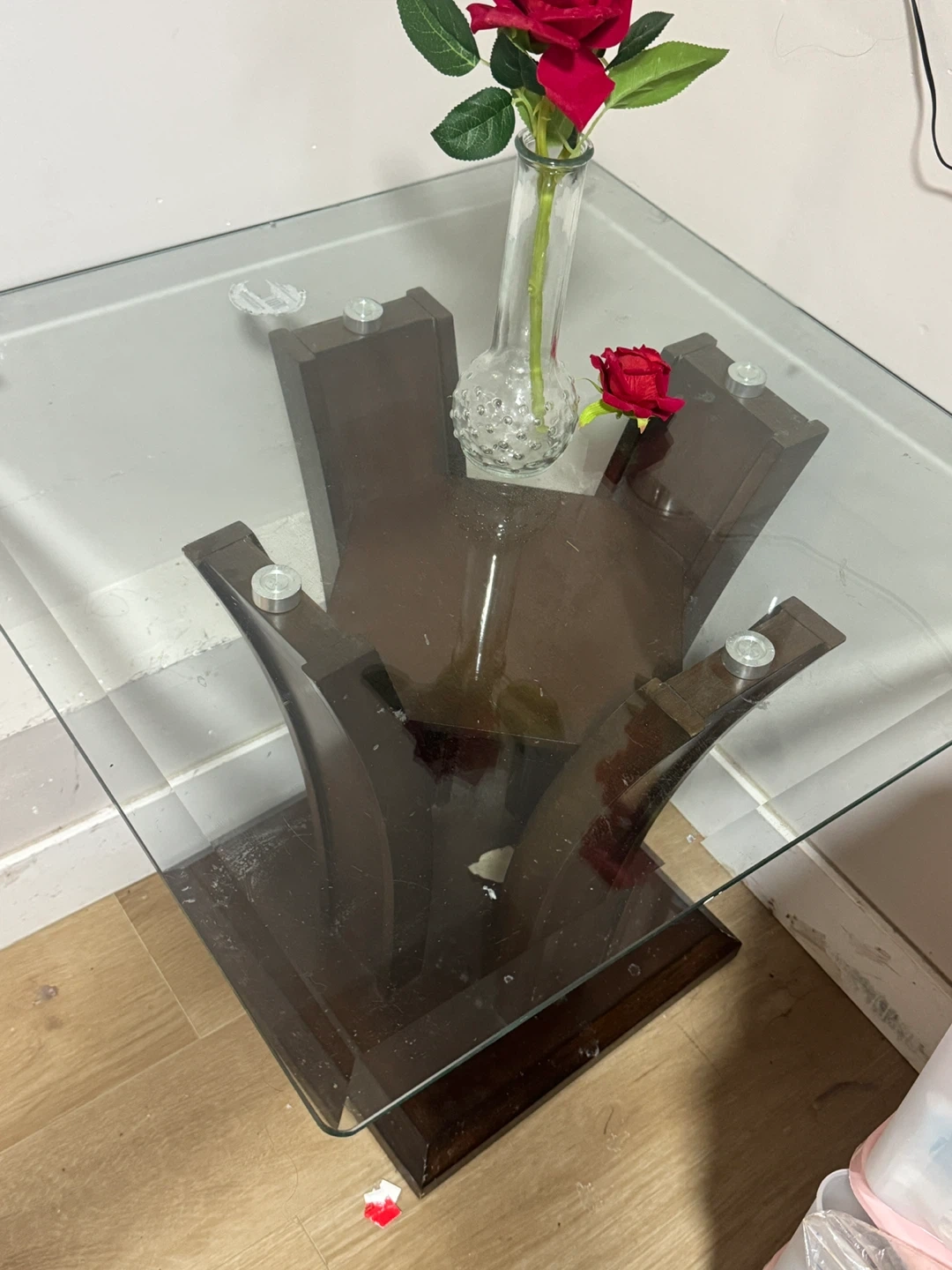 Selling a glass top coffee table with a unique wooden base. It's in good condition and would be a great addition to any living room