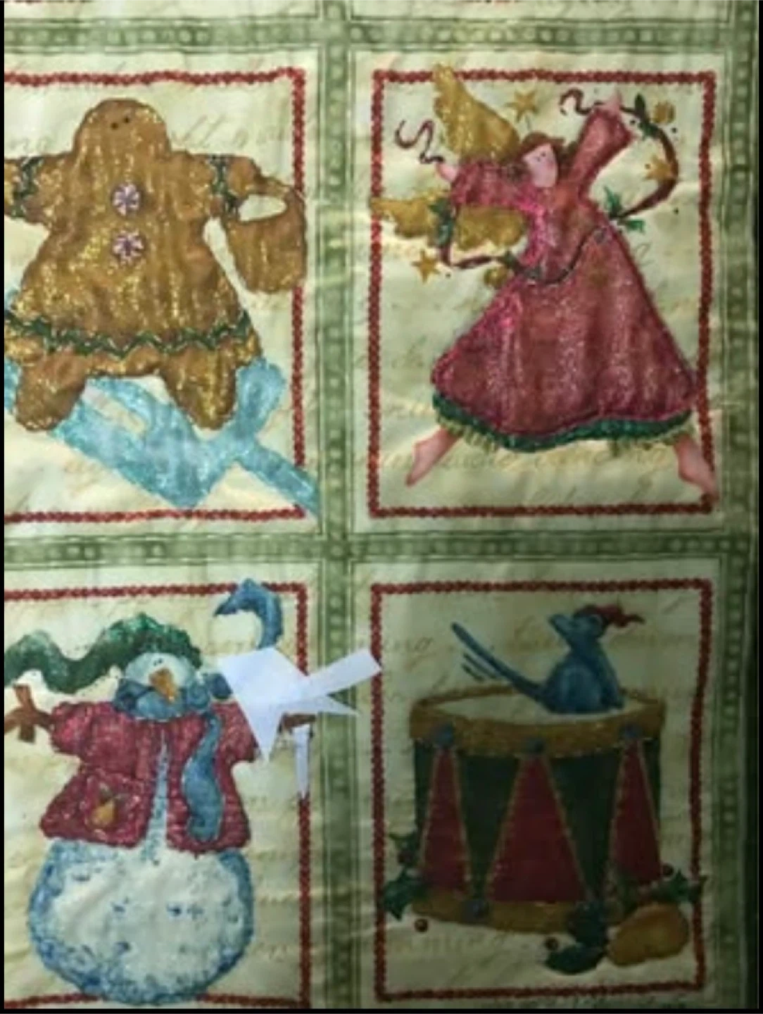 The images have been hand stitched to give it dimension and then hand painted to further enhance the beauty of this piece. The backing is a brown metallic pre quilted fabric that wraps over the front and then is machine stitched making a stunning frame. Hanging this is quite easy. Insert a wooden dowel or a lovely curtain rod in the already made pocket across the top.It features charming designs like a gingerbread man, an angel, a snowman, and a drum, all within individual squares. Perfect for adding a cozy, festive touch to your home during the holidays!