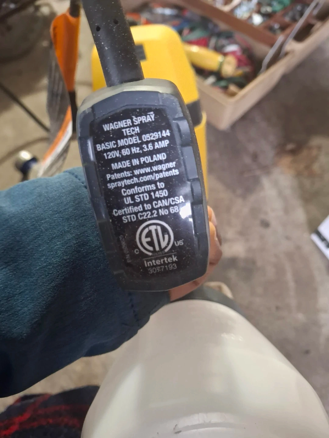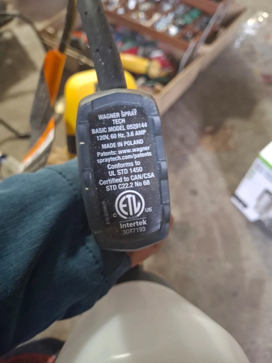 Selling a Wagner Spray Tech paint sprayer. It's the Basic Model 0529144, 120V, 60 Hz, 3.6 AMP. It was made in Poland and conforms to UL STD 1450, certified to CAN/CSA STD C22.2 No 68