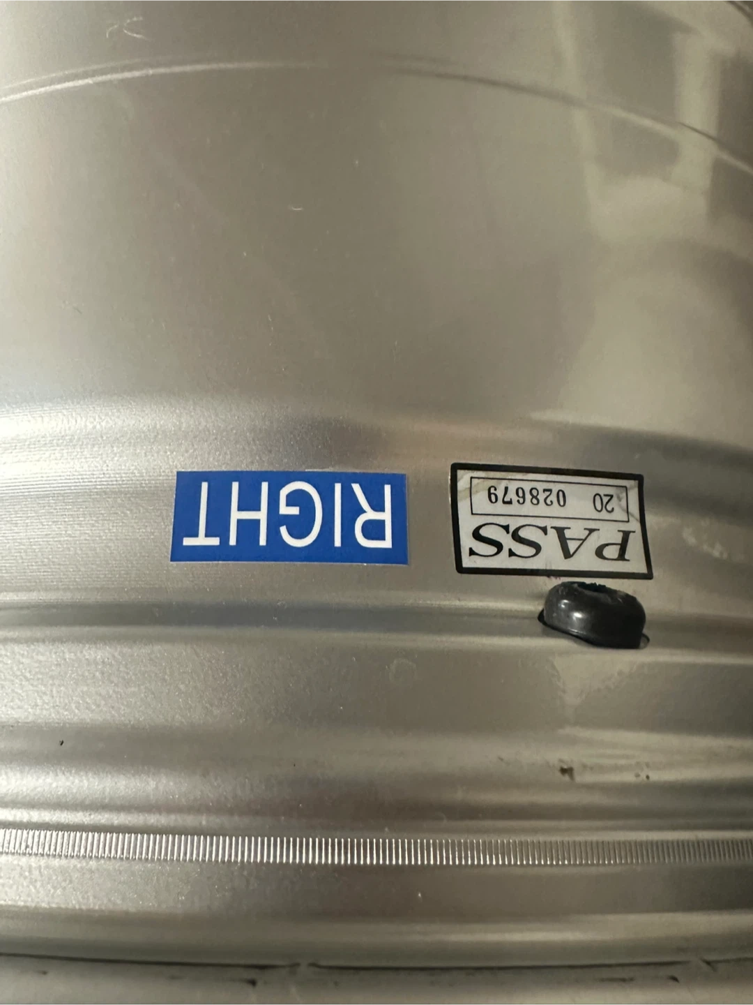 Selling a set of silver alloy wheels. The wheels have a 'PASS 20' and 'RIGHT' marking on them. The size appears to be H216x16H2 22X10.6J. They are in good condition and ready for a new home!