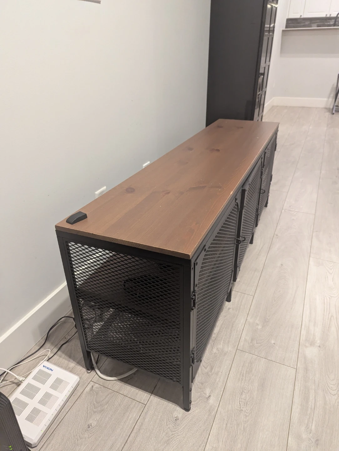 TV stand with a black metal frame and a wood top. It features a mesh design on the doors and shelves for storage. Great for adding an industrial touch to your living room!