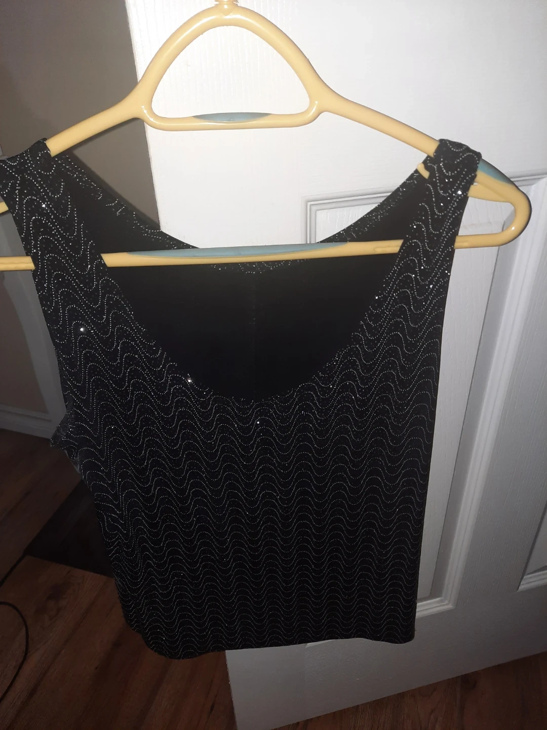 The item in the image is a black, long-sleeved, sparkly top. It is a tank top with a matching jacket