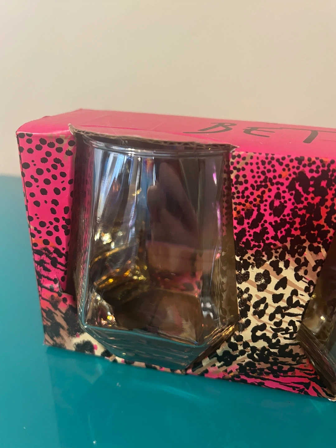 Brand new in original box. Clear glass with stylish faceted design. Perfect for whiskey, cocktails, or as a chic gift. Fun leopard print packaging.