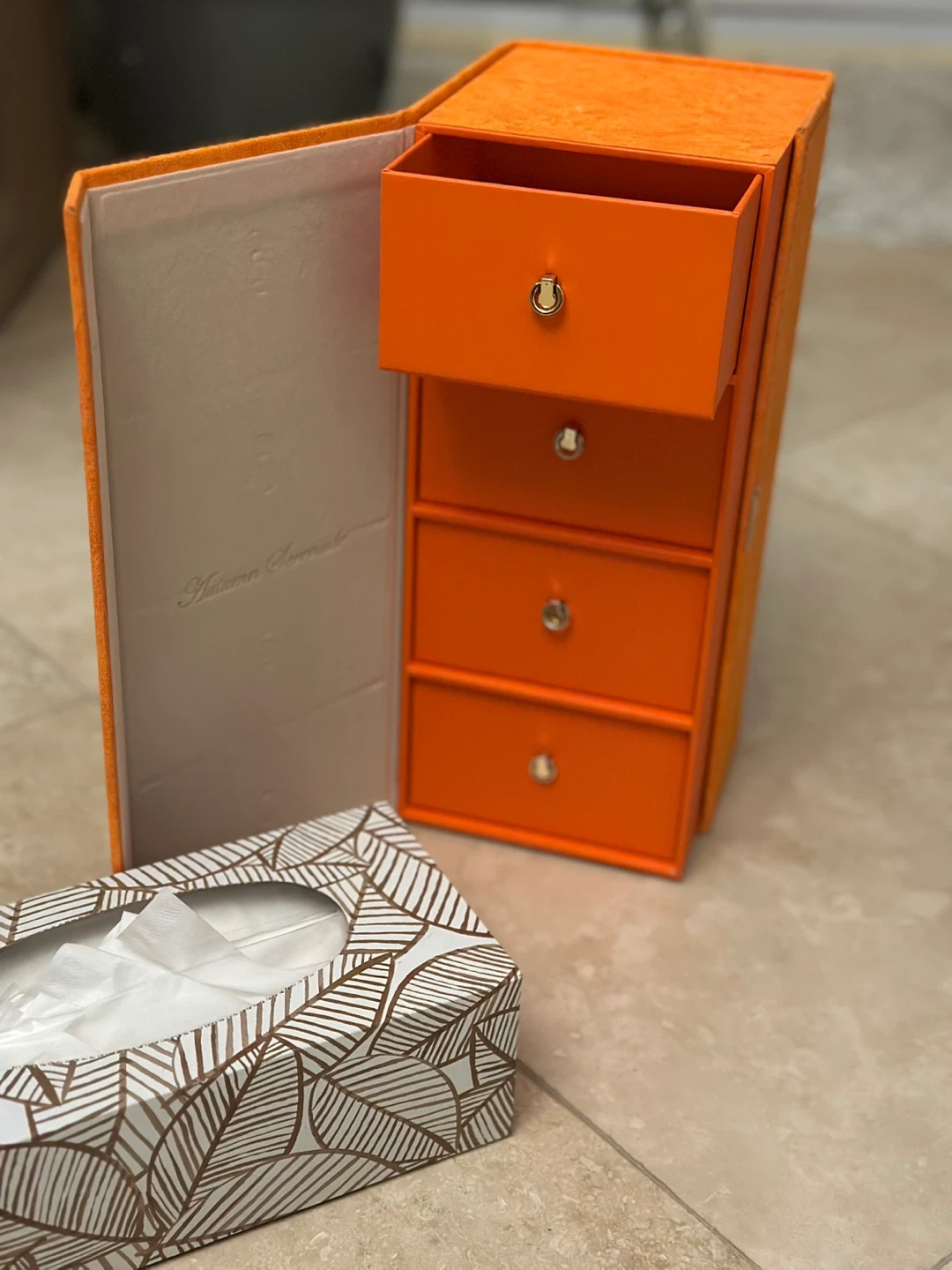🥕Selling an Autumn Sonata jewellery box in a vibrant orange colour! It has a unique design that resembles a book, opening to reveal several drawers for storing your precious items