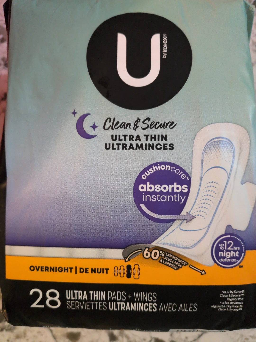 Selling a package of U by Kotex Clean & Secure Ultra Thin Pads with wings. This overnight pack contains 28 ultra-thin pads designed for up to 12 hours of night defence. They feature a cushioncore that absorbs instantly and have a 60% larger back for added protection