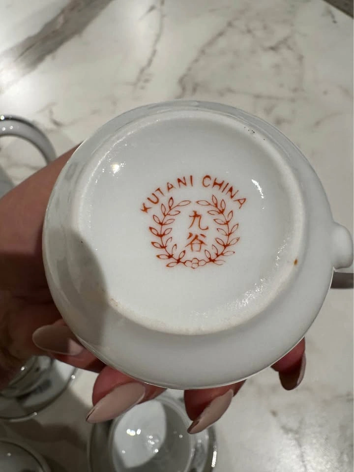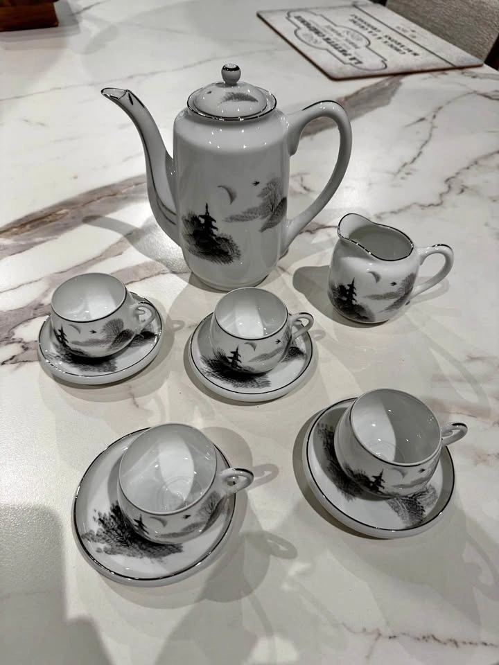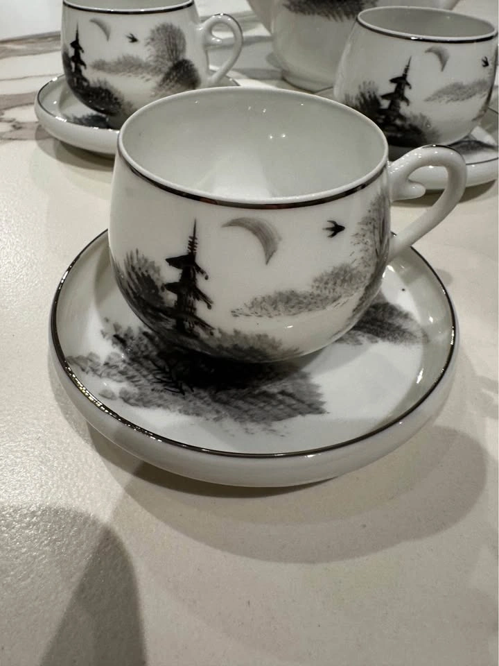Kutani Japanese porcelain tea set. Teapot, creamer and four cups and saucers. White with black scenery. One small chip on teapot spout.