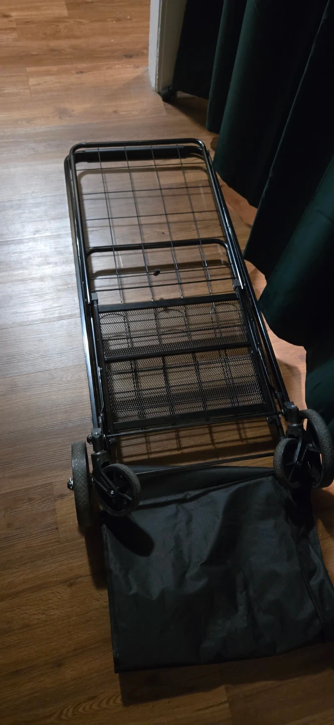 Selling a black folding shopping cart. It's in good condition and ready to help with your grocery runs or trips to the farmers market! Folds up easily for storage