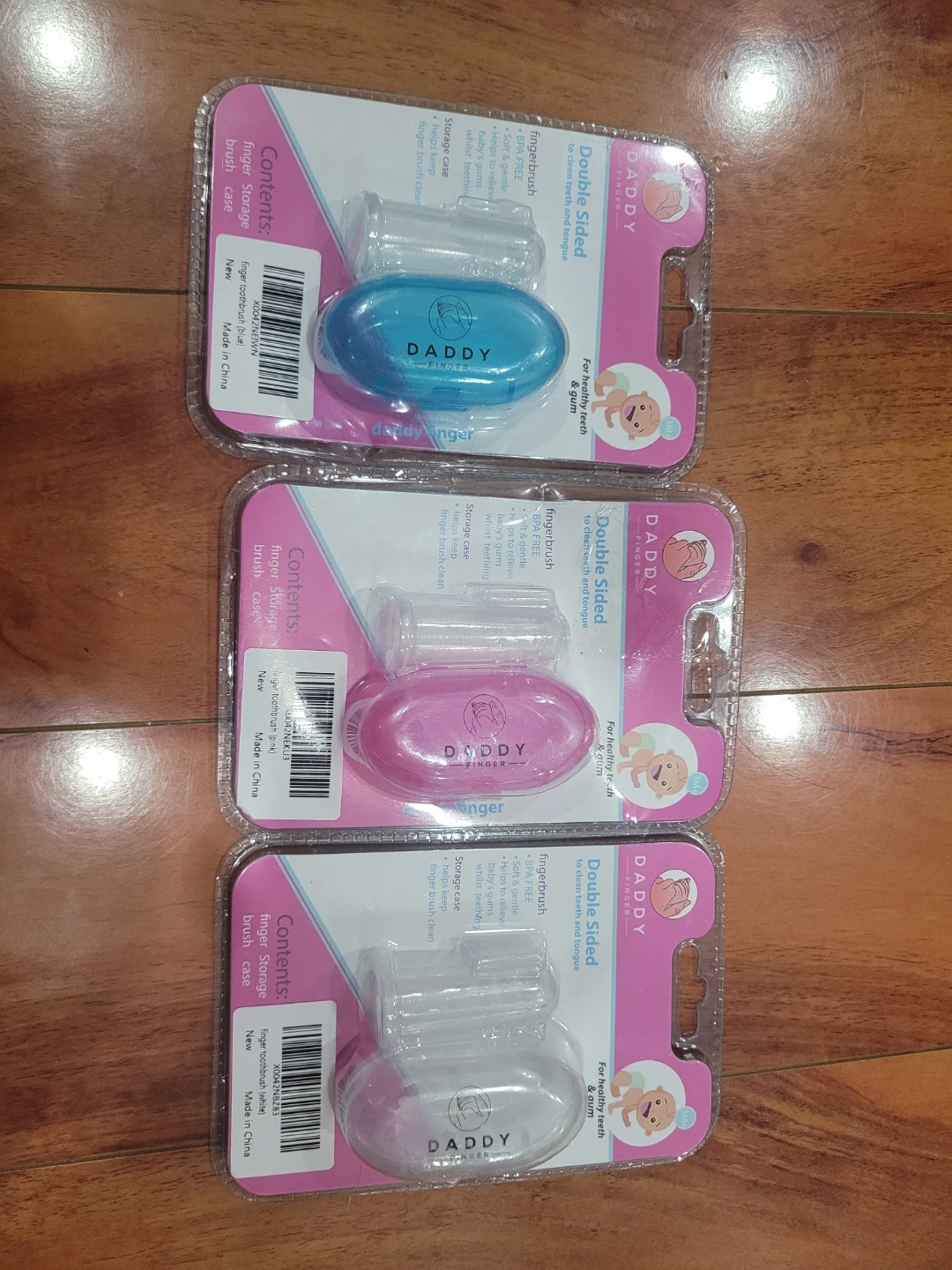 I'm selling new Daddy Finger double sided finger toothbrushes! These are great for cleaning your baby's teeth and gums gently. The soft bristles help to relieve discomfort while teething. Each brush comes with its own storage case to keep it clean and ready to use