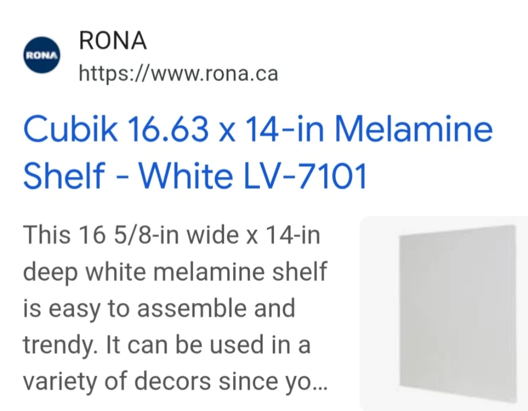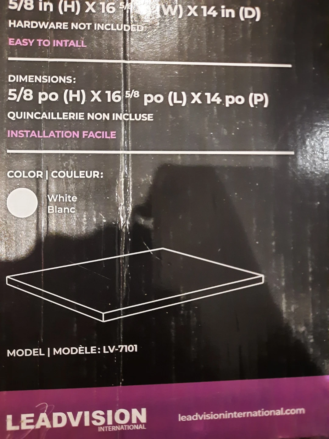 Selling a Cubik multipurpose melamine shelf! It's white and measures 16 5/8 inches wide by 14 inches deep. Easy to install, this shelf can be used in a variety of decors. Hardware is not included.