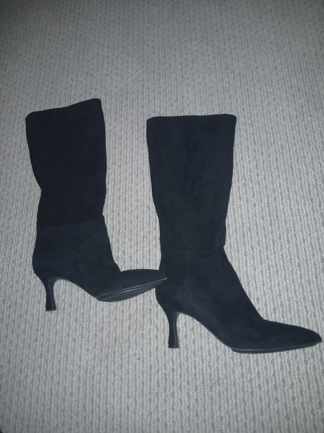 Selling a pair of Anne Klein black fabric boots in size 6.5. They have a fabric upper, lining, and sock, with a fabric flocked outsole. These stylish boots are perfect for any occasion!