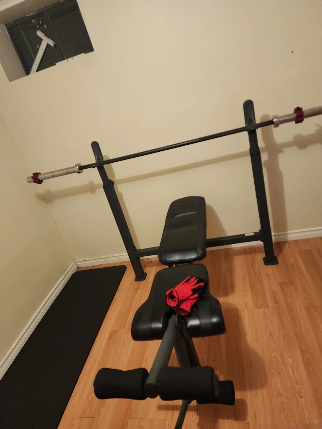 Selling a weight bench with barbell. It's in great shape and ready for a new home gym! The bench is sturdy and comfortable, perfect for various exercises. Includes the barbell for a complete workout setup
