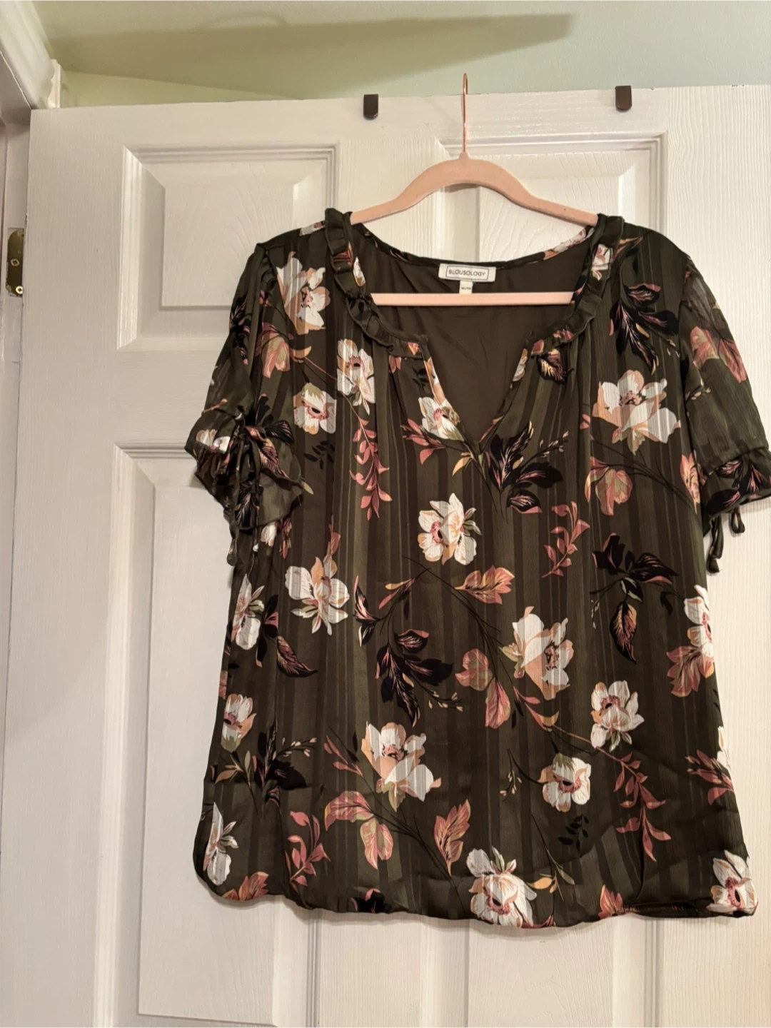123Here's a lovely blouse in size XL. It features a beautiful floral pattern on an olive green background. Perfect for adding a touch of elegance to your wardrobe!