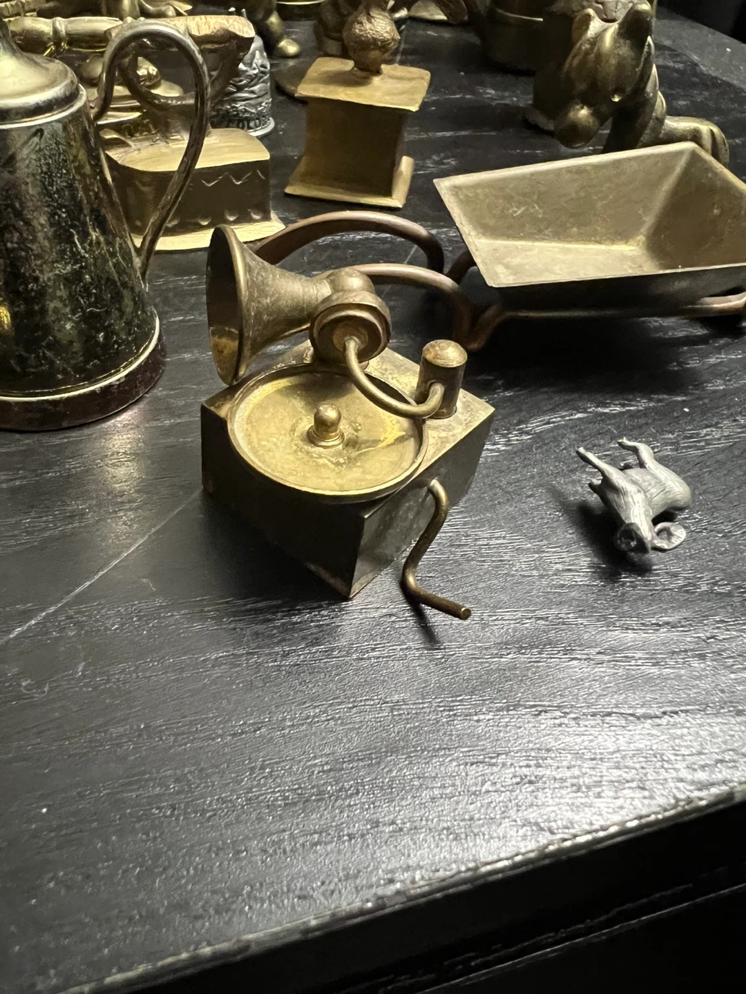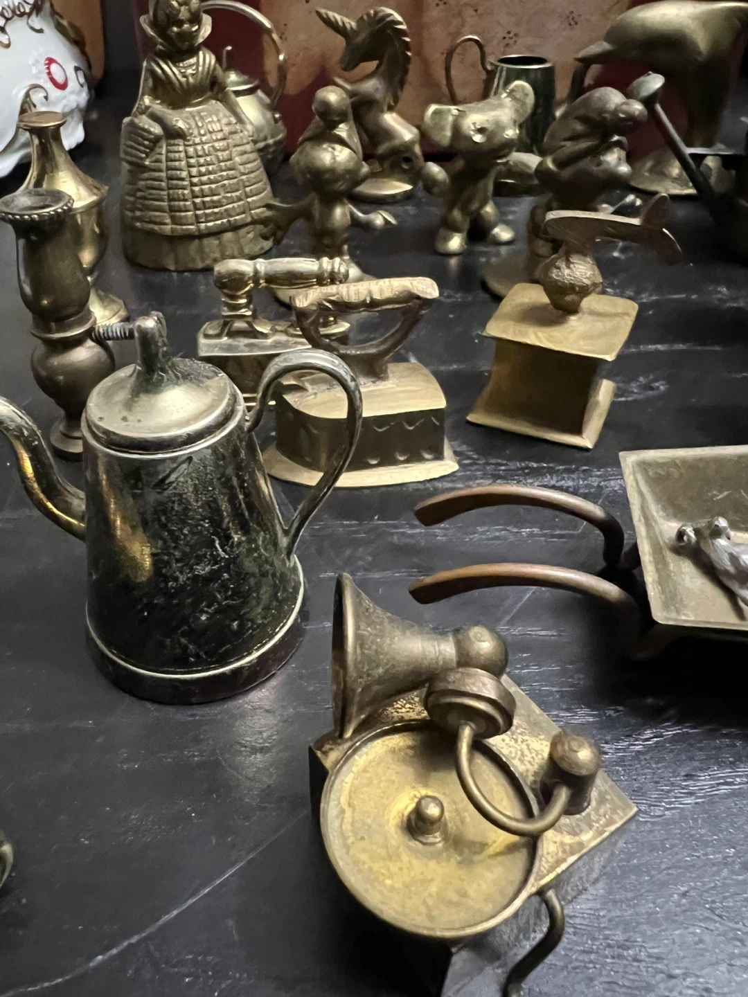A collection of vintage brass figurines and miniatures. Includes figurines of Smurfs, animals, miniature irons, and other interesting pieces. Great for collectors or anyone who appreciates unique decor!