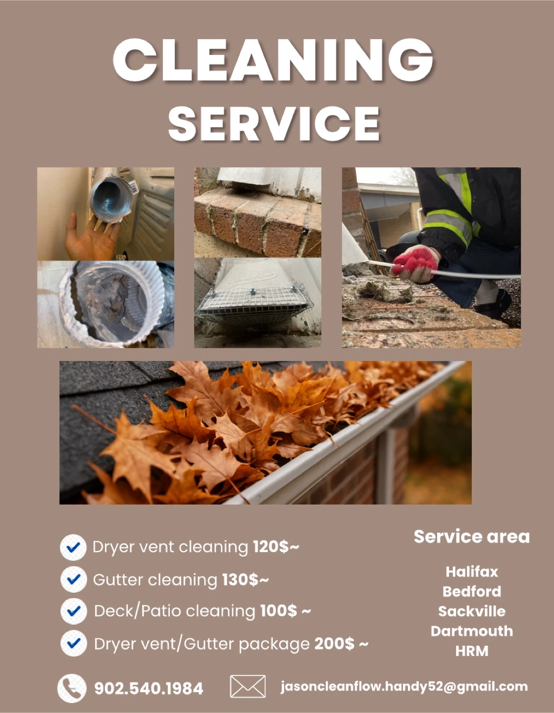 Cleaning service available for dryer vents, gutters, and decks/patios.