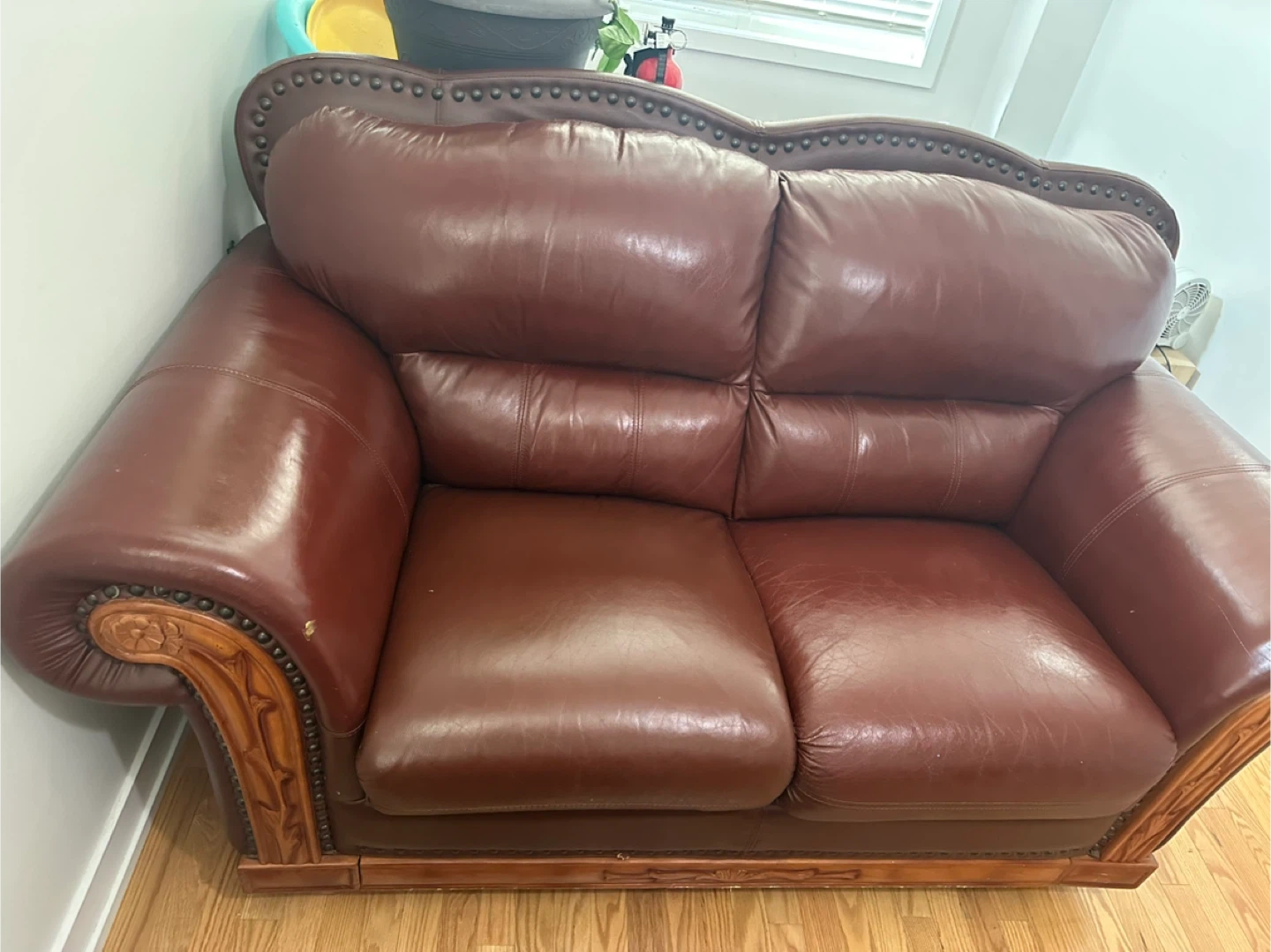 Selling a lovely leather sofa and armchair set. The set is in good condition and would look great in any living room or den. The leather is a beautiful brown colour.