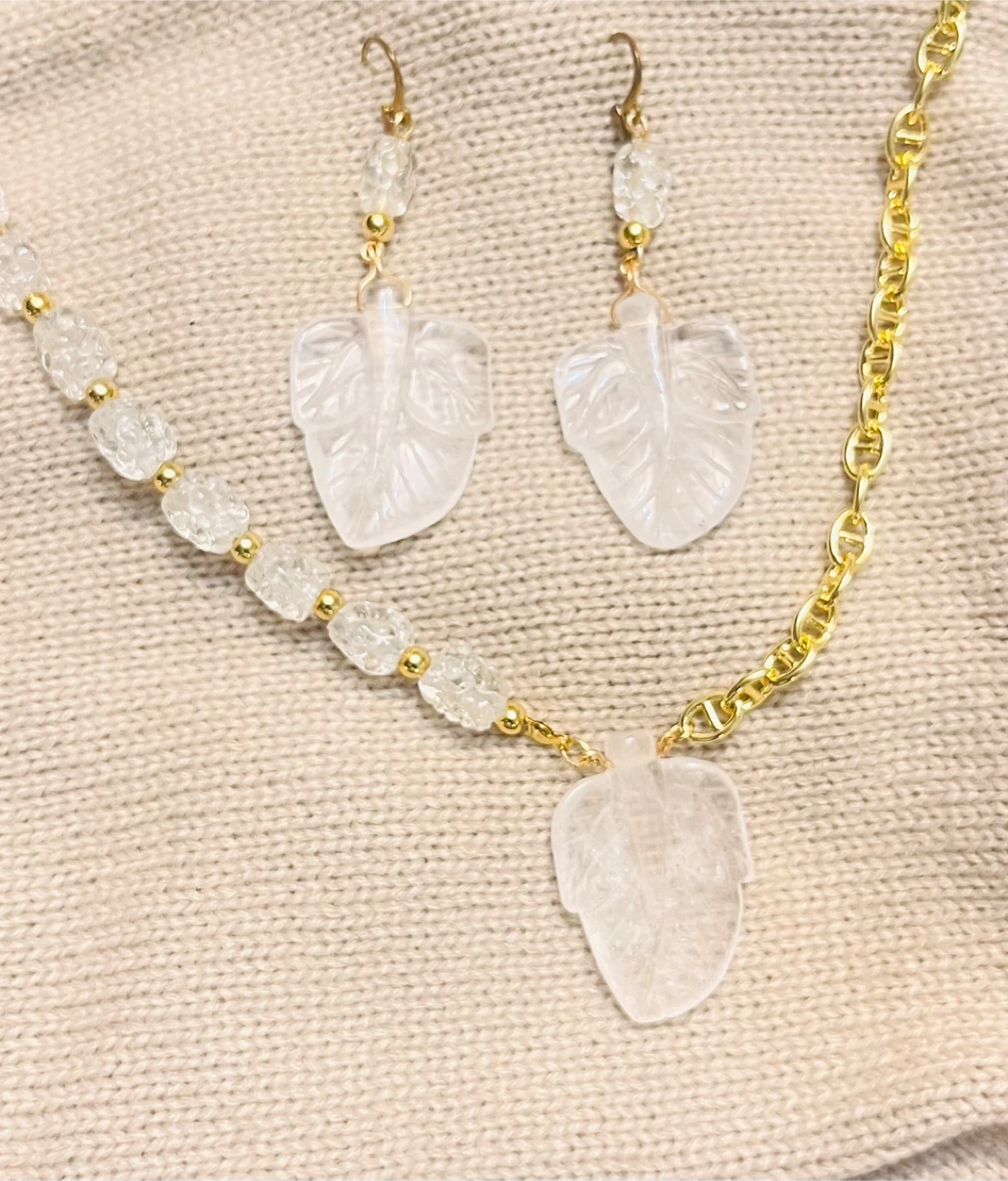 Selling a beautiful necklace and earring set! The set features a clear stone leaf design with gold accents. Perfect for adding a touch of elegance to any outfit