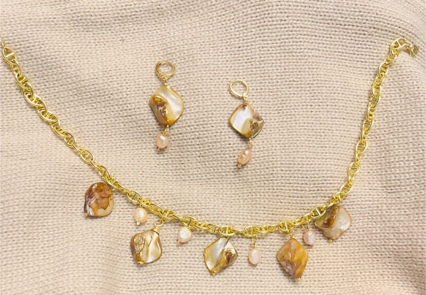 Selling a handmade necklace and earring set. The necklace features a gold chain with shell and pearl charms. The matching earrings have a similar design with shell and pearl accents. Perfect for adding a unique touch to any outfit!