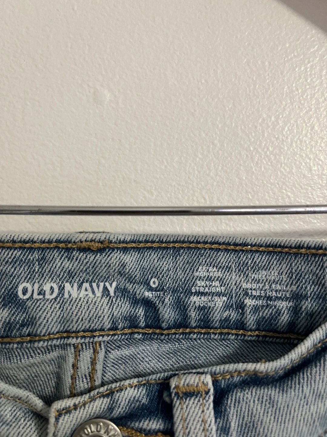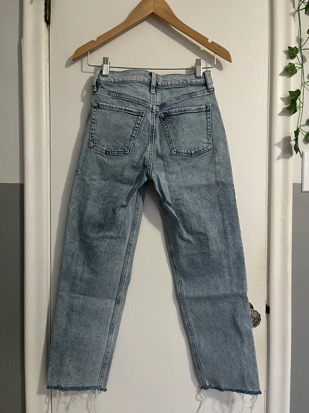 Selling a pair of Old Navy high waisted straight jeans in a size 0. The denim has a light wash and raw hems. They're in great condition and ready for a new home!