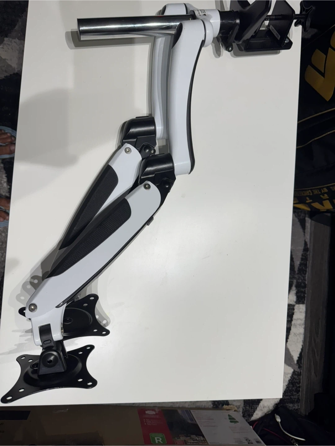 Selling a monitor arm desk mount in white and black. It's in great condition and ready to help you optimize your workspace! Perfect for decluttering your desk and improving ergonomics