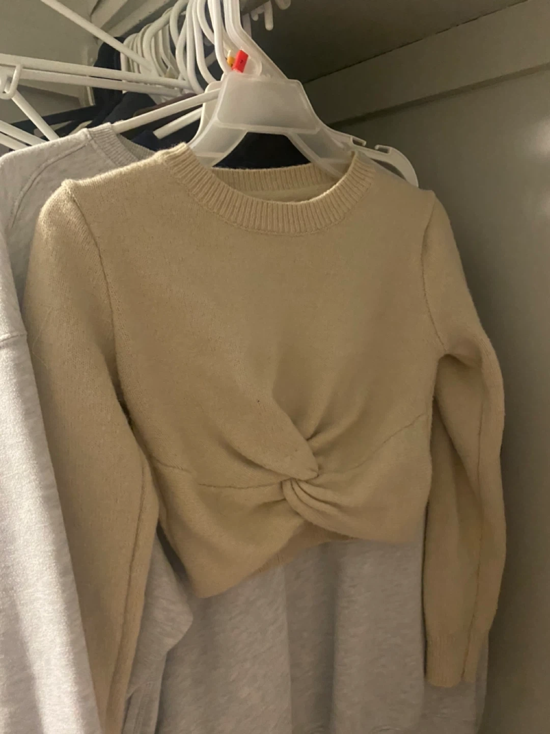 Selling a cute beige knitted crop top sweater. It has a stylish knot detail in the front. Perfect for layering or wearing on its own!