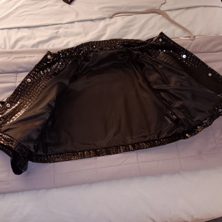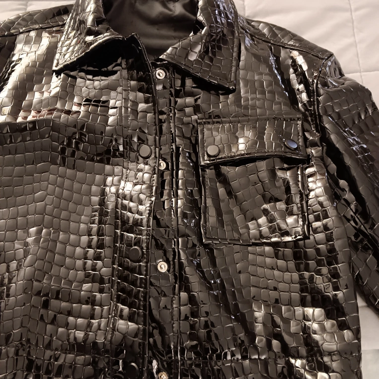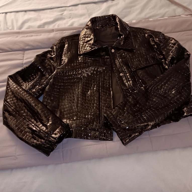 Stylish Le Alesco jacket (Tom Ford look-alike) with a unique black crocodile pattern. It's a size small great condition! Black snaps, waist length. soft and supple...not stiff.