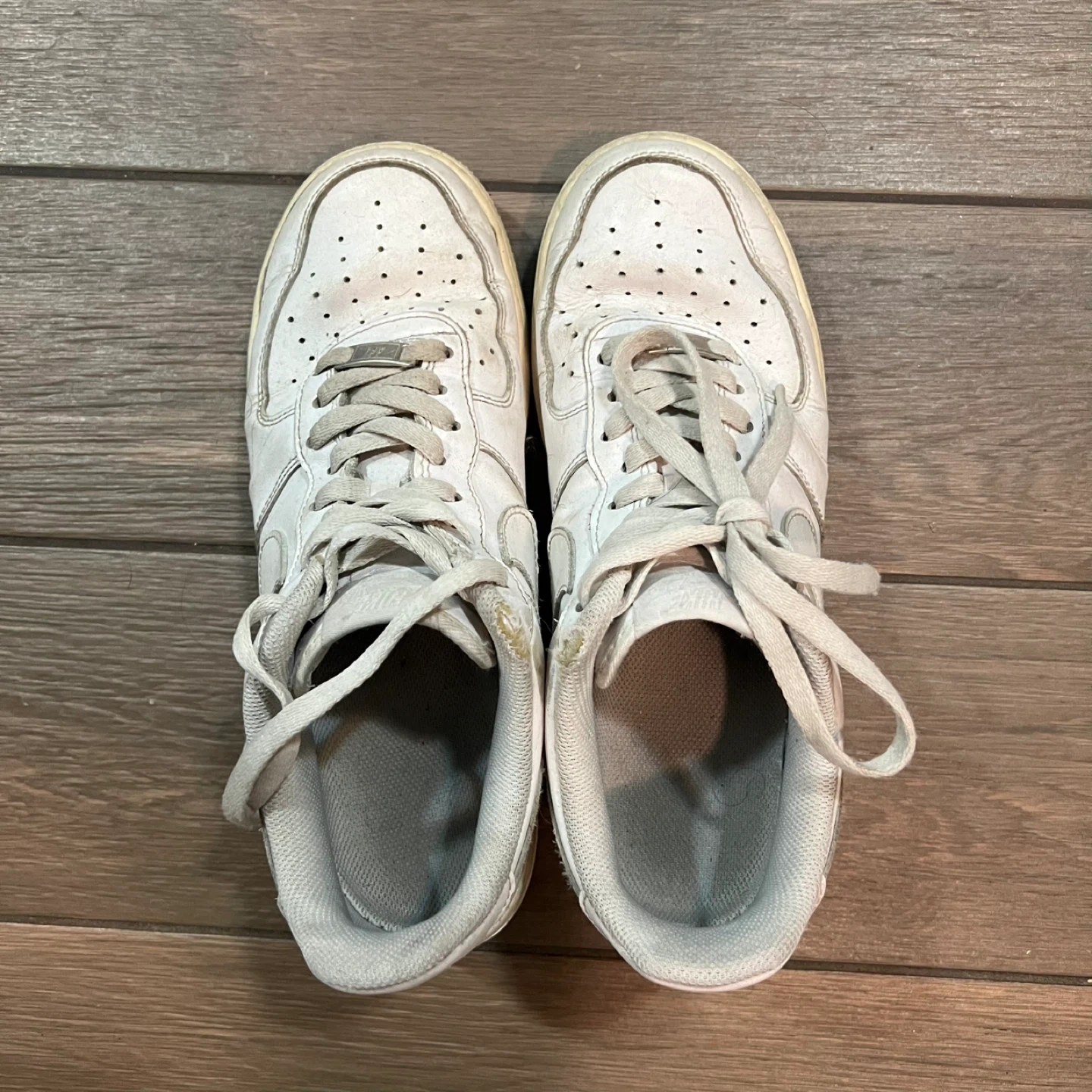 181Selling a pair of well-loved Nike Air Force 1 sneakers. They show signs of wear. US 10