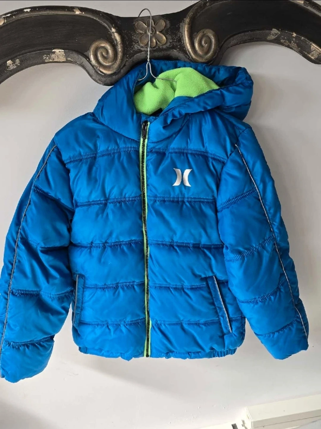 Here's a Hurley kids' puffer jacket in a vibrant blue! It features a cozy green lining inside the hood and a full zipper. Perfect for keeping your little one warm and stylish during the colder months