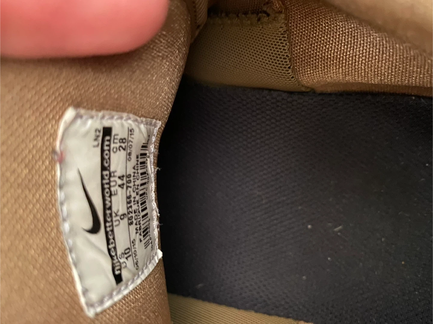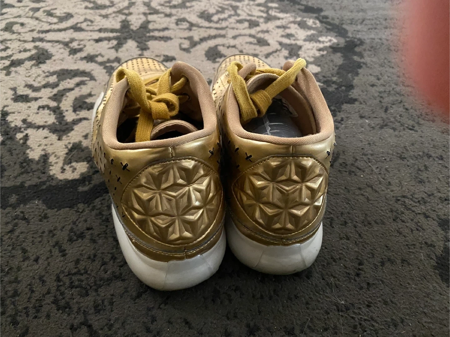 Selling a pair of Nike Kobe X Elite Low HTM shoes in gold. They are in used condition. The size is US 10, UK 9, EUR 44, and CM 28.