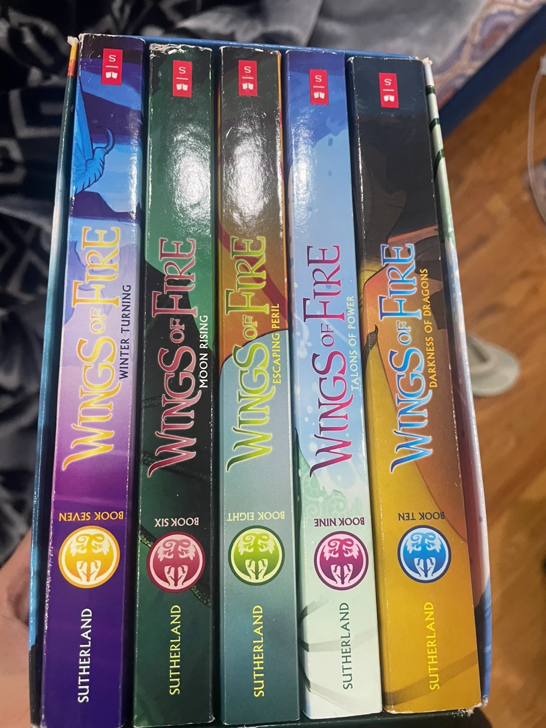15Selling a set of Wings of Fire books, specifically books 6 through 10. They're in great shape and ready for a new home! The series is by Tui T. Sutherland and includes Winter Turning, Moon Rising, Escaping Peril, Talons of Power, and Darkness of Dragons. Has a case for the books included as a set, taking most offers!!