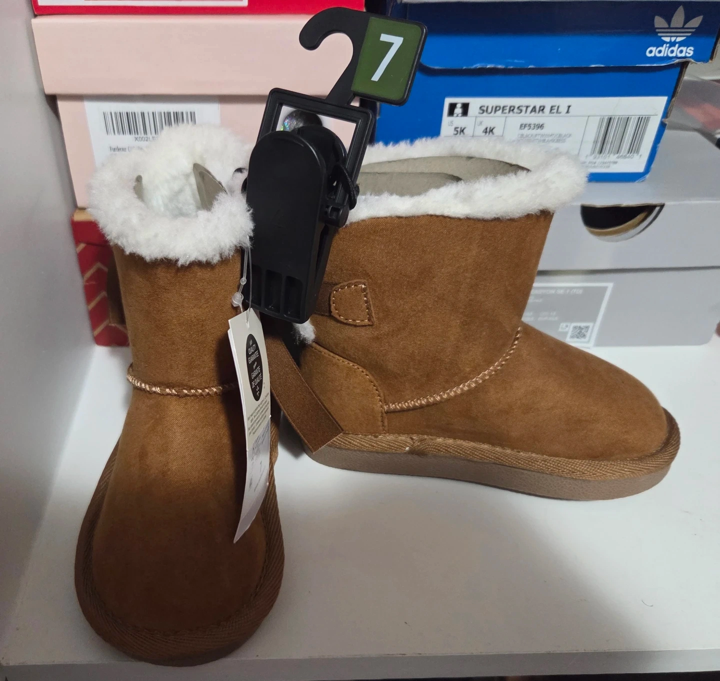 I have a pair of brand new brown winter boots in size 7. They come with the original box. These are Adidas Superstar EL I boots, perfect for keeping your little one's feet warm this winter!