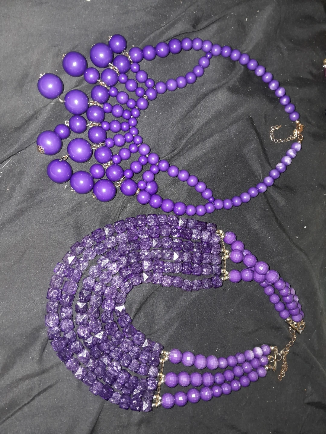 Two beautiful purple beaded necklaces! One is a multi-strand design with faceted beads, and the other features round beads in varying sizes. Both are in great condition and ready to add a pop of colour to your wardrobe