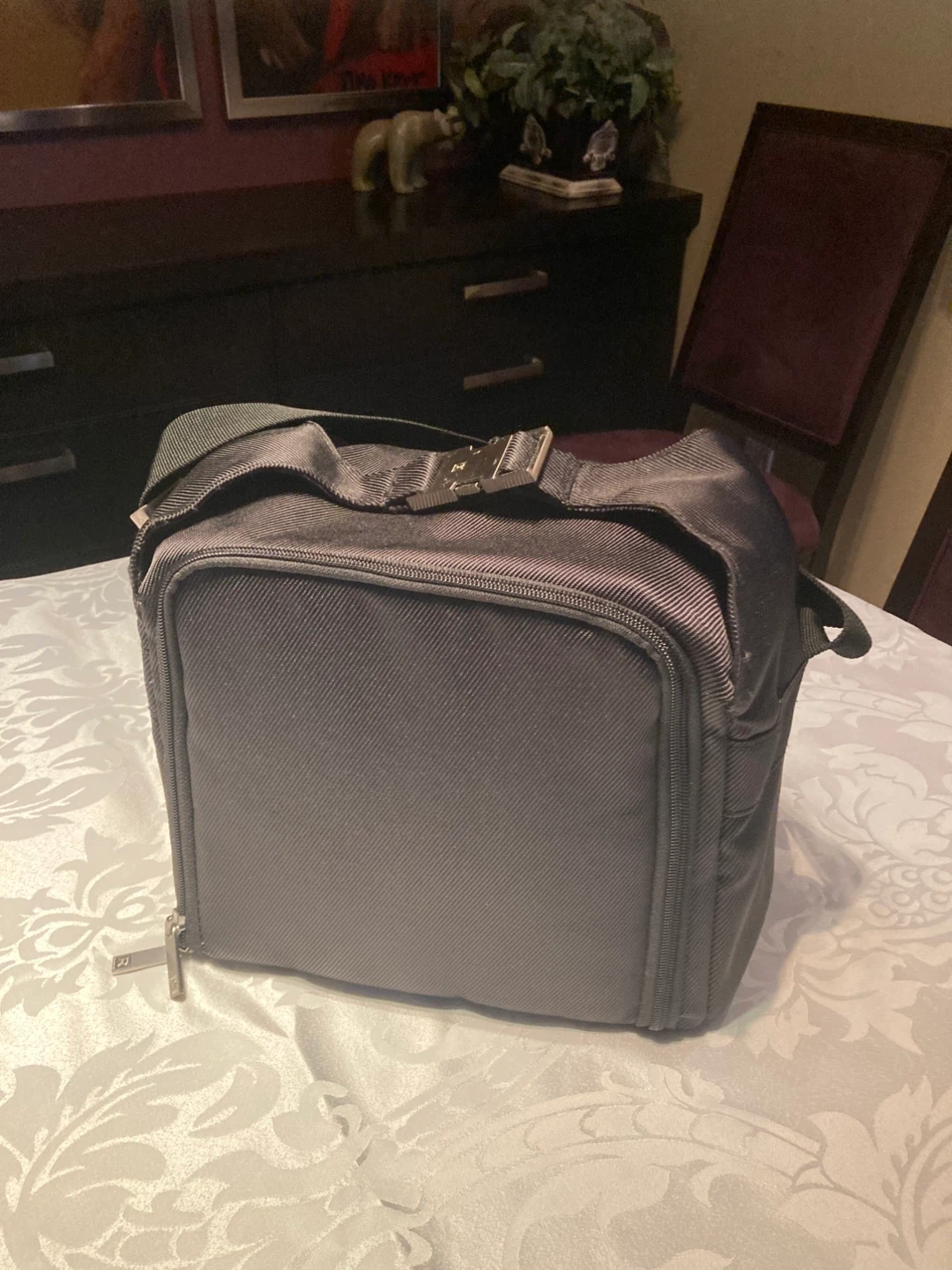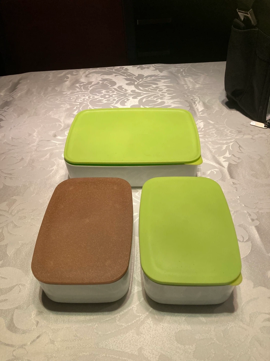 Selling a lunch bag that comes with containers! The bag is black and has a metallic interior lining, and can be carried by the attached handle or by an included shoulder strap. The containers have a mix of green and brown lids. New, never used. Includes a small round container for salad dressing or dip.