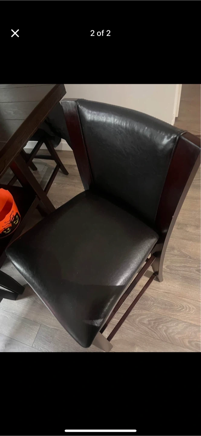Selling a dining table set complete with four chairs! The chairs have a dark wood frame and black leather seats. Perfect for a small dining area or kitchen nook. Brand new 5-month-old dining set. No scratches or damage present.