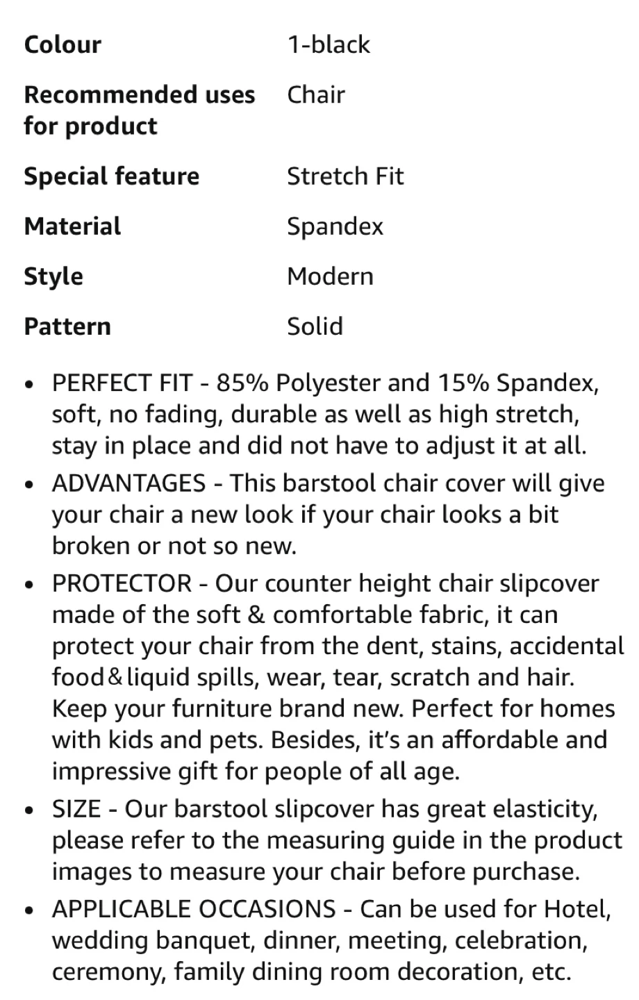 Get a new look for your bar stools with these WOMACHO covers! They're designed for counter height side chairs and come in a pack of four. The covers are black and made from a stretchy spandex material for a snug fit. They're great for protecting your chairs from spills, wear, and tear, and can be used in hotels, wedding banquets, dining rooms, and more
