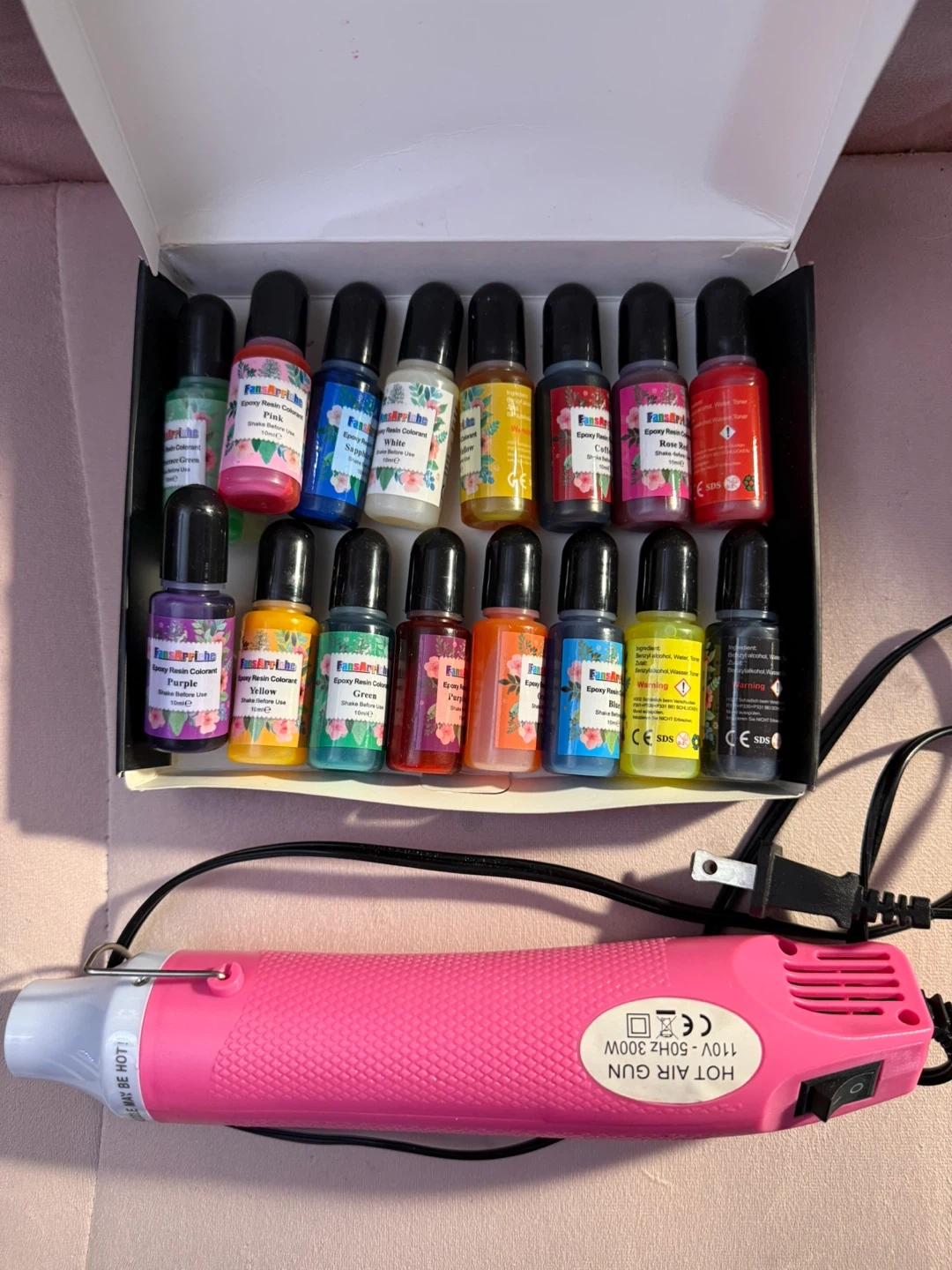 Selling a set of FansArcht.Lbe epoxy resin colorants, complete with a variety of colours to add vibrancy to your resin art projects! Also included is a hot air gun, perfect for removing bubbles and ensuring a smooth finish. Comes with the original box!