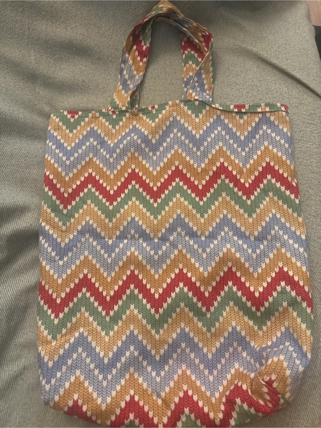 Here's a tote bag with a fun chevron pattern! It features a colourful design with red, green, blue, and tan hues. Great for carrying books or groceries.