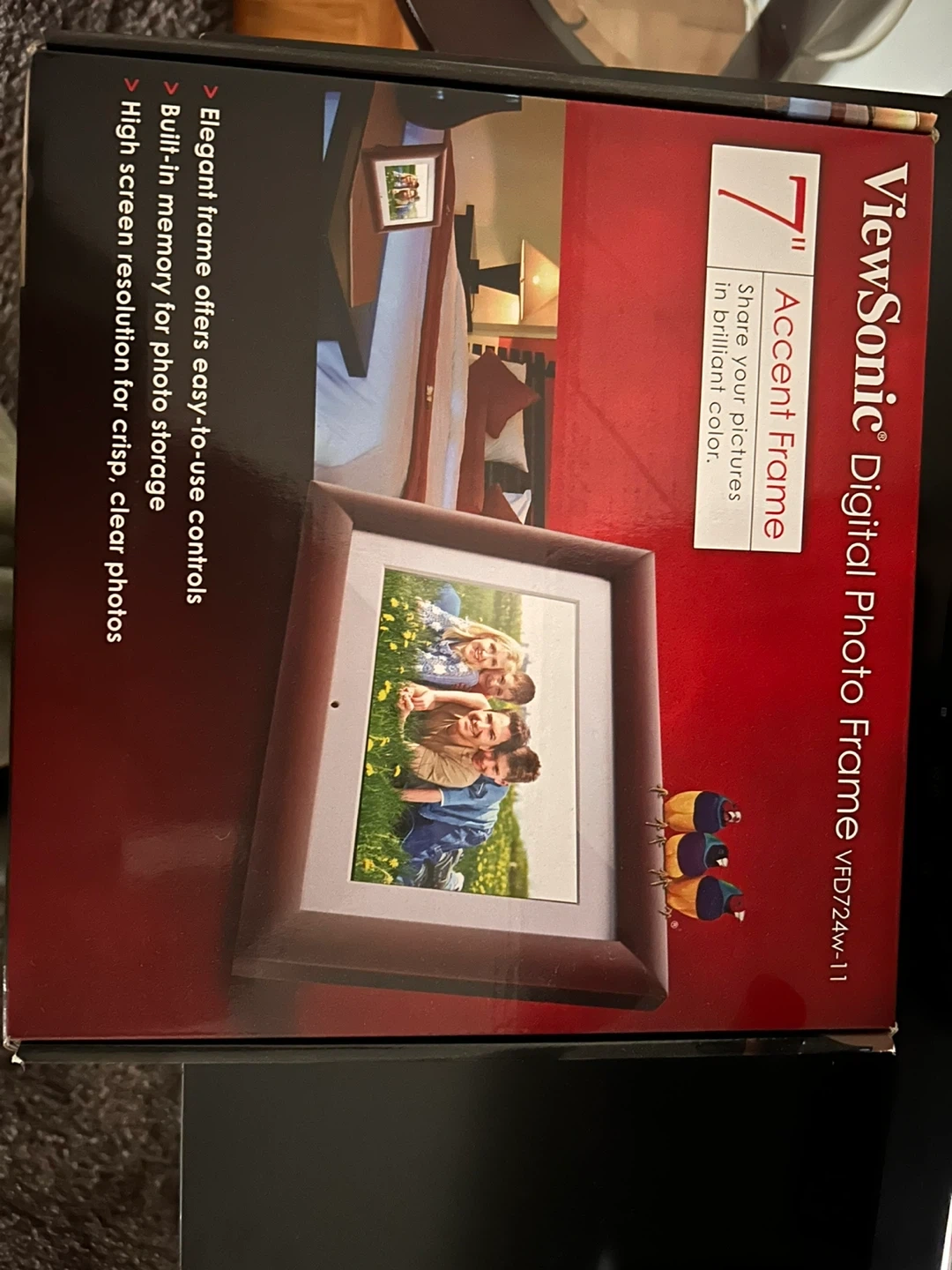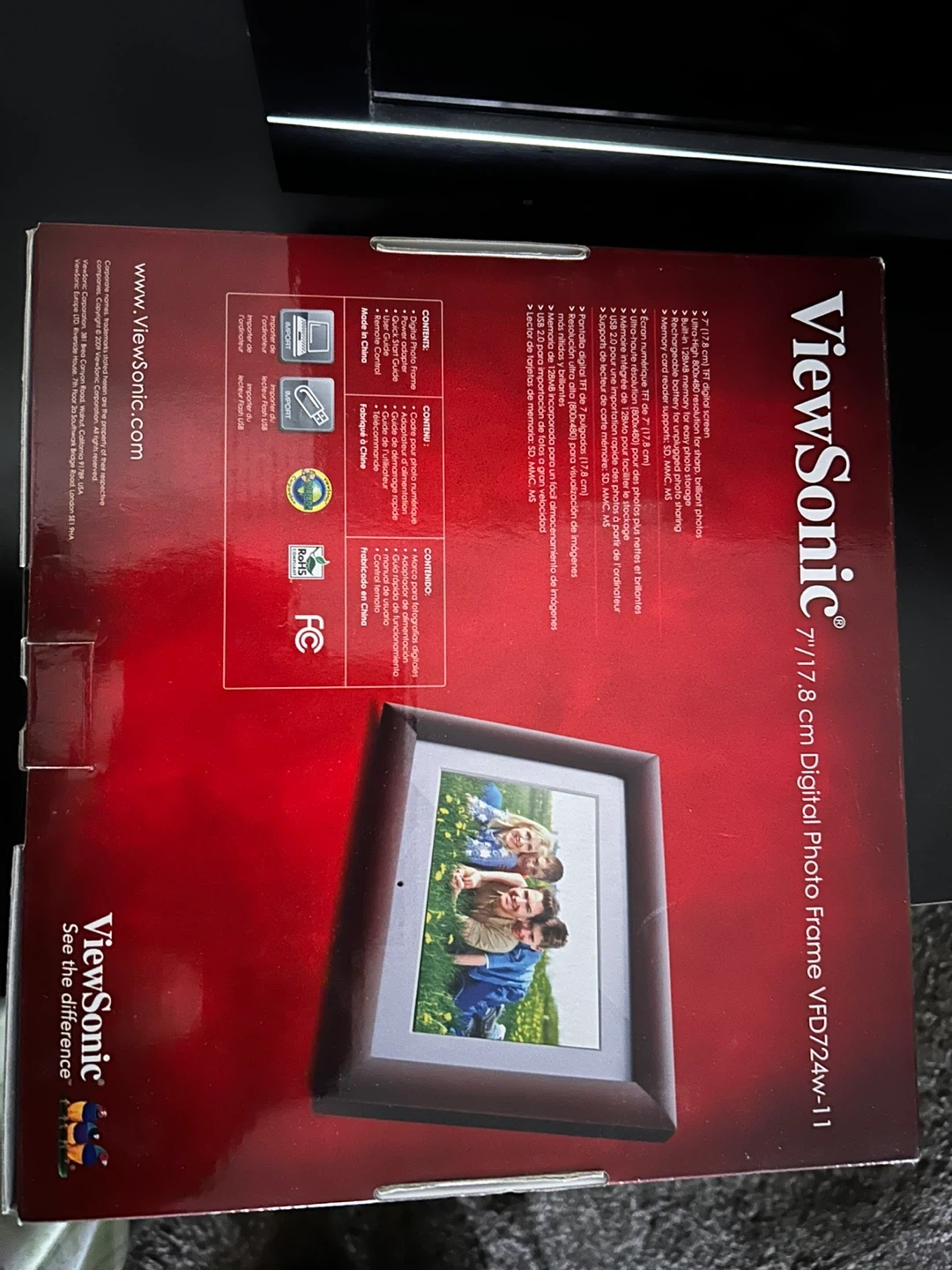 Selling a ViewSonic 7" digital photo frame! It's the VFD724W-11 model. The box is included. It features an elegant frame with easy-to-use controls, built-in memory for photo storage, and high screen resolution for crisp, clear photos.