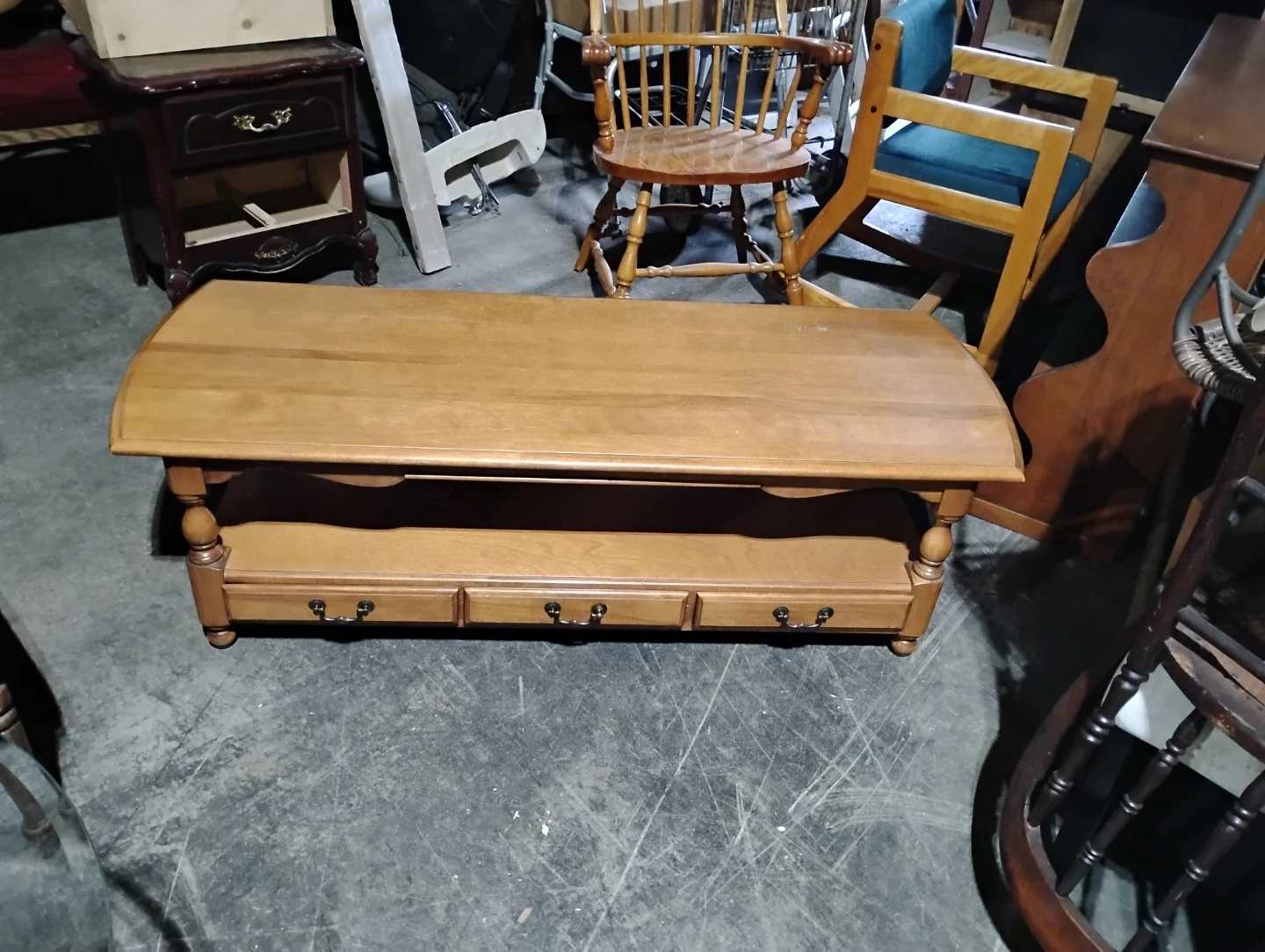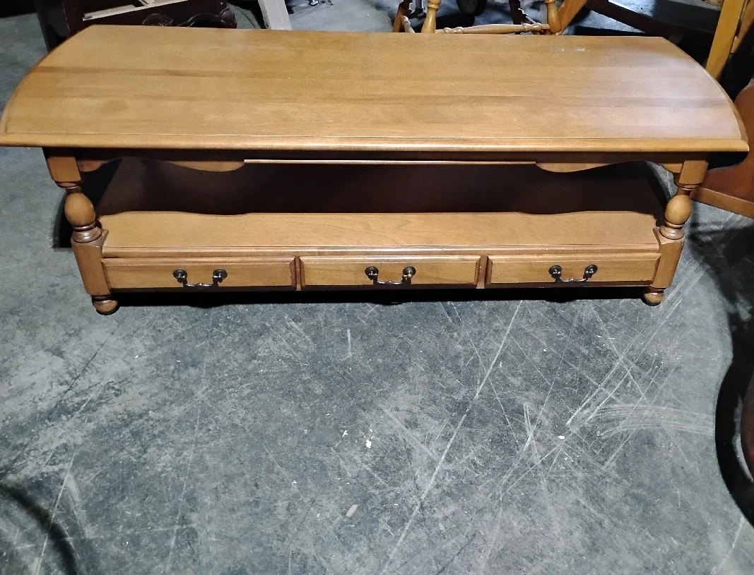 Here's a lovely wooden coffee table, perfect for your living room! It features a classic design with a shelf and drawers for extra storage. The warm wood tone will complement any decor! there is a little issue with one of the drawer