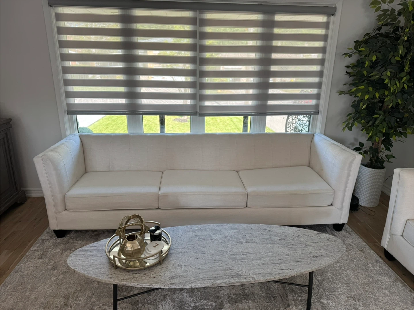 Selling a lovely white sofa. It's in good condition . Tufted buttons are off couch but I have them. Slight stains but can be cleaned . Couch is 9 ft long . Custom made .