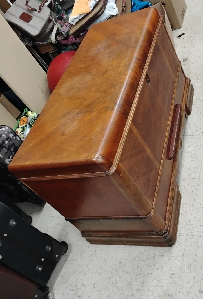 Selling a vintage wooden cedar chest. It's in good condition and would be great for storing blankets or other items. It has a beautiful wood grain pattern and a classic design.