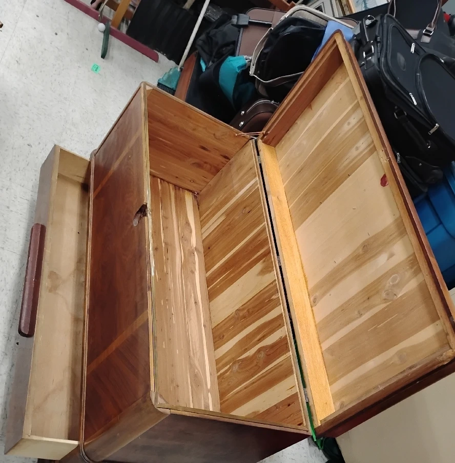 Selling a vintage wooden cedar chest. It's in good condition and would be great for storing blankets or other items. It has a beautiful wood grain pattern and a classic design.