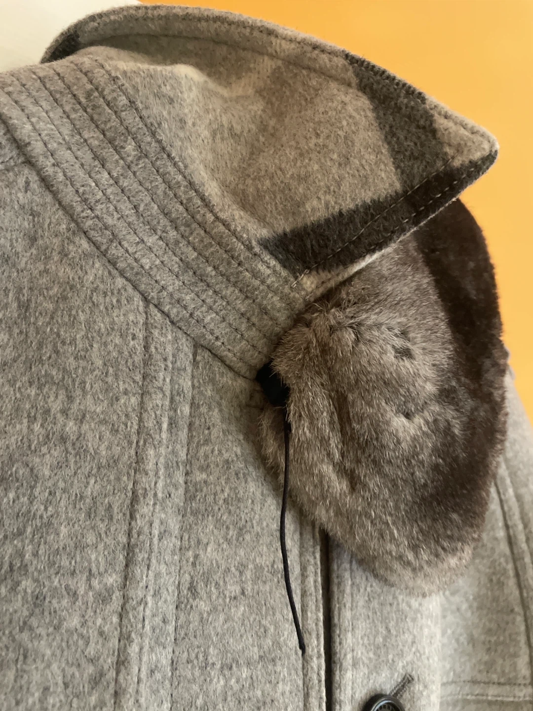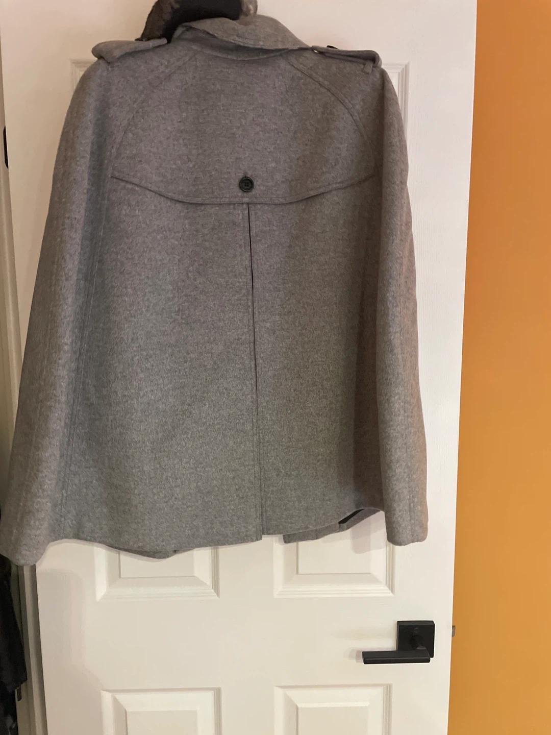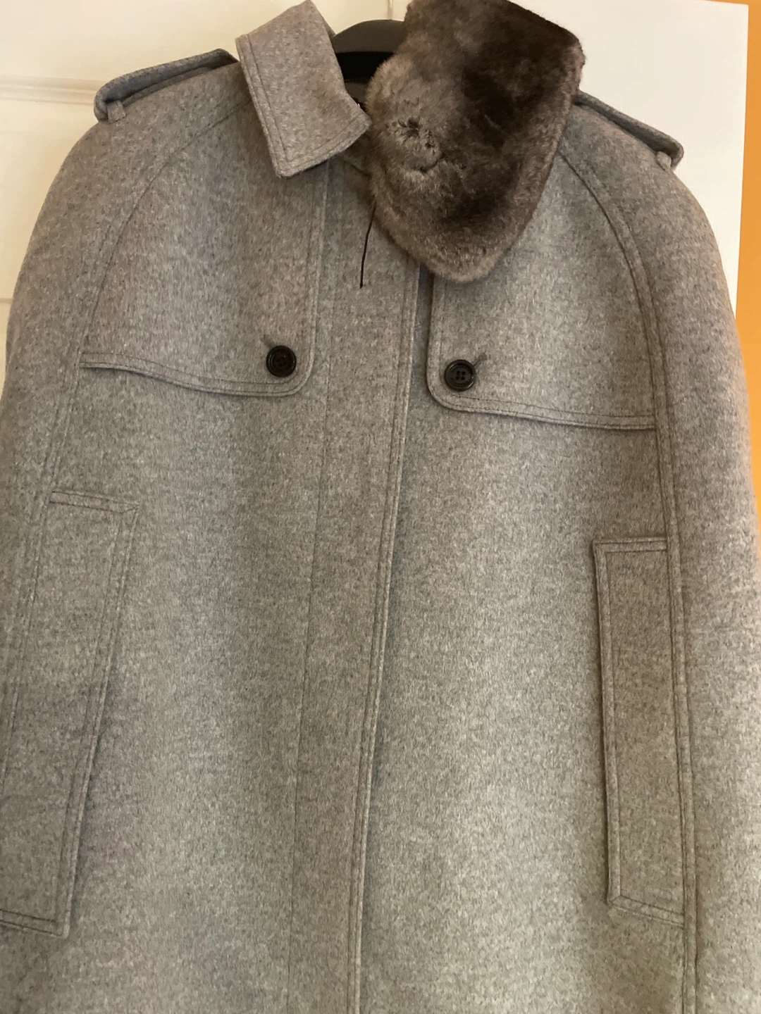 Selling a stylish Burberry London England wool coat! It's a size L and in great condition. The coat features a chic design with fur detailing around the collar. Perfect for staying warm and fashionable during the colder months!