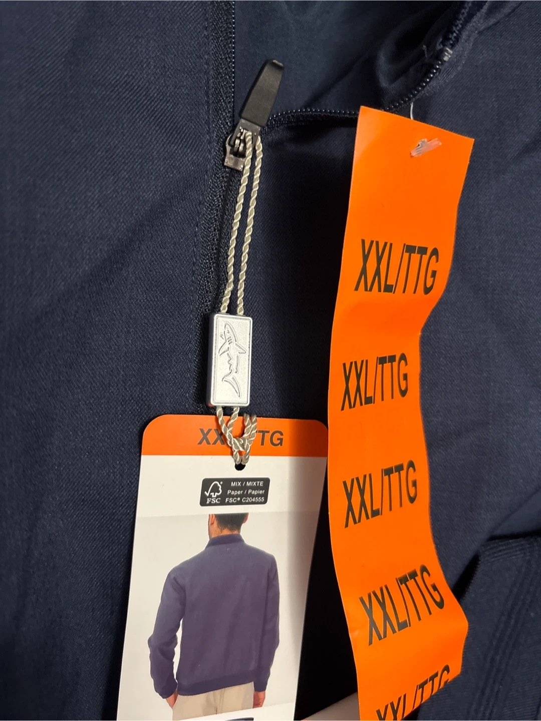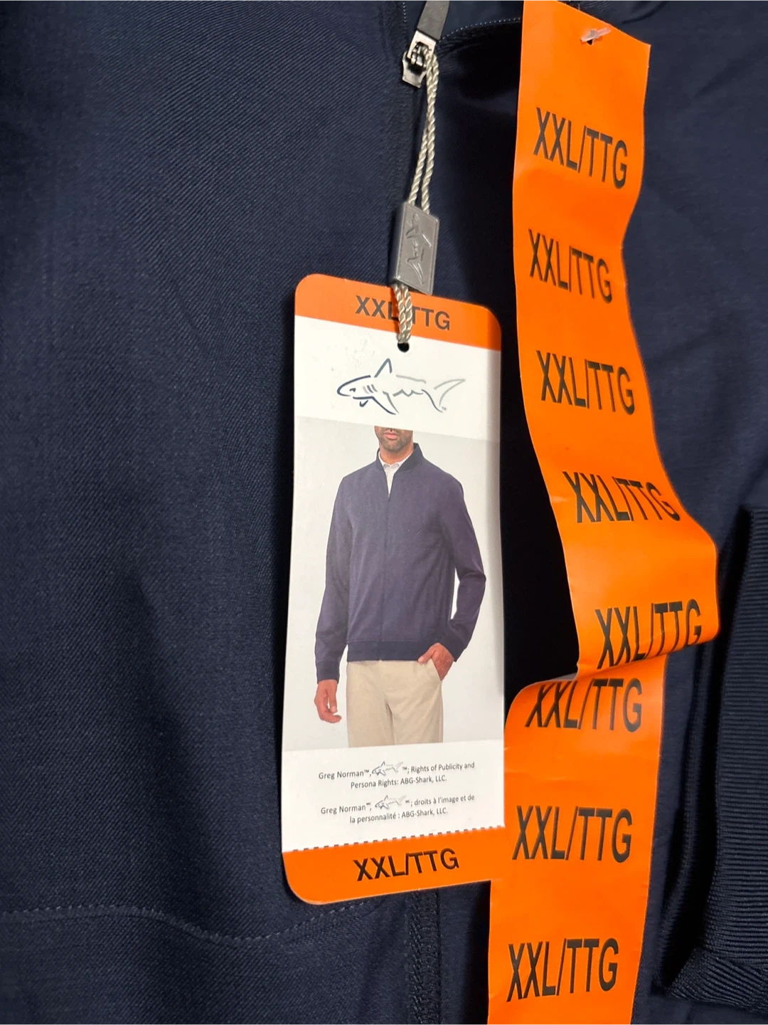 102Check out this brand new Greg Norman jacket! It's a stylish navy blue and comes in size XXL. Perfect for adding a touch of class to your wardrobe!