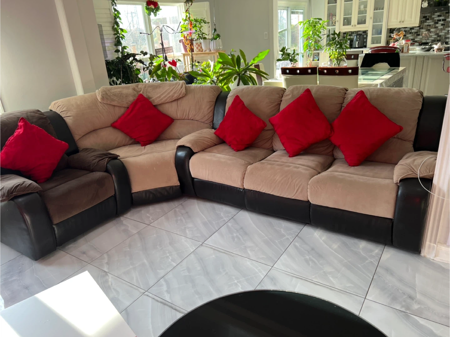 Selling a comfortable sectional sofa with some stylish red pillows! It's a great addition to any living room space