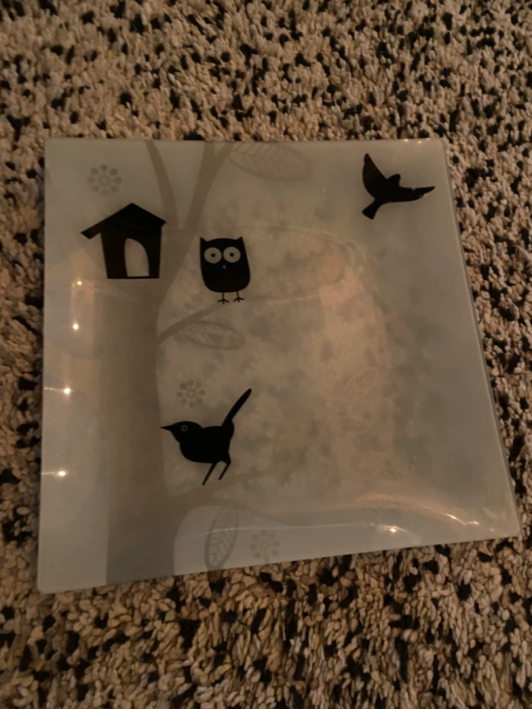 Selling a lovely decorative glass plate. It features a cute design with birds, an owl, and a birdhouse. Perfect for adding a touch of whimsy to your home decor!