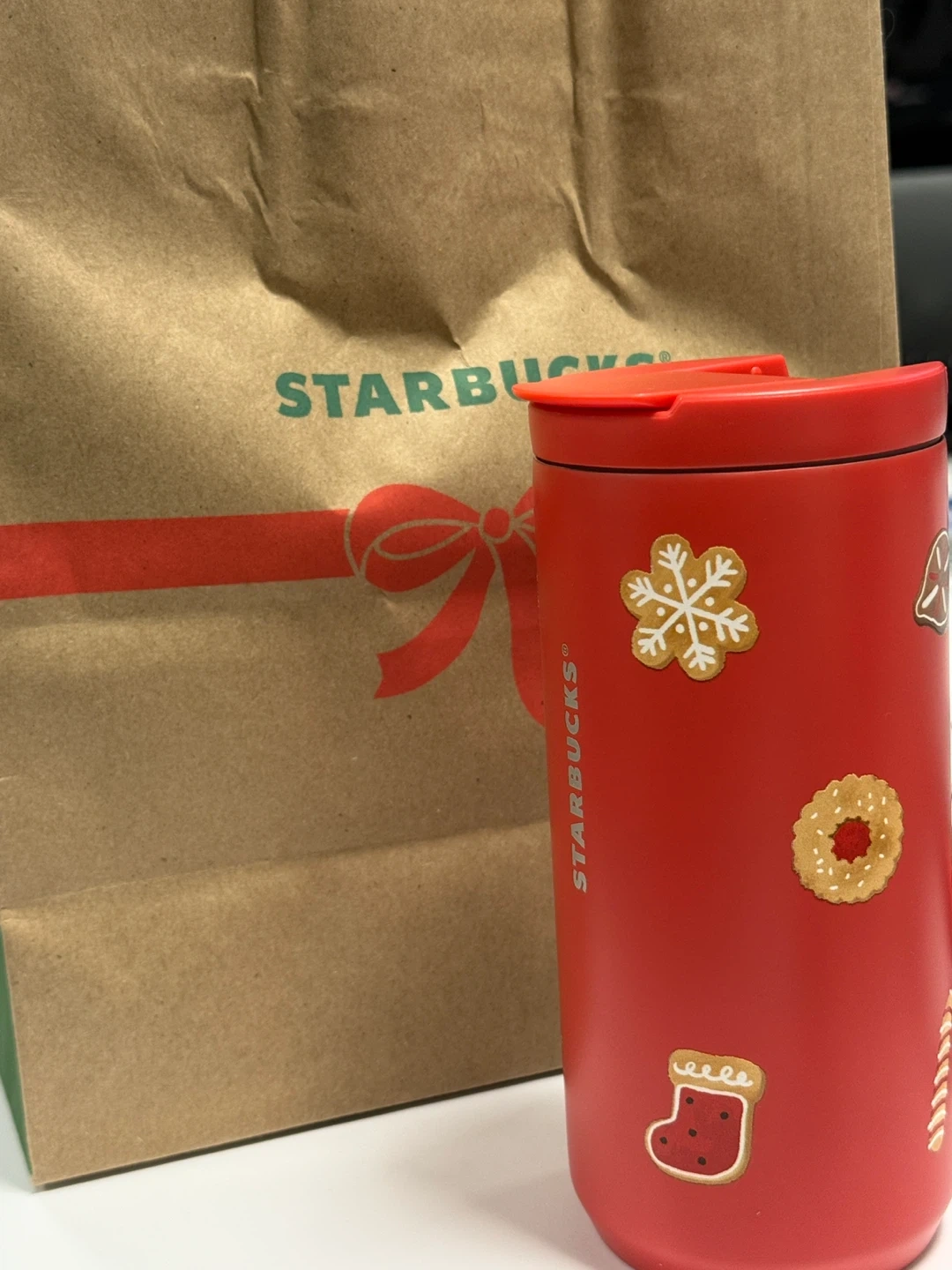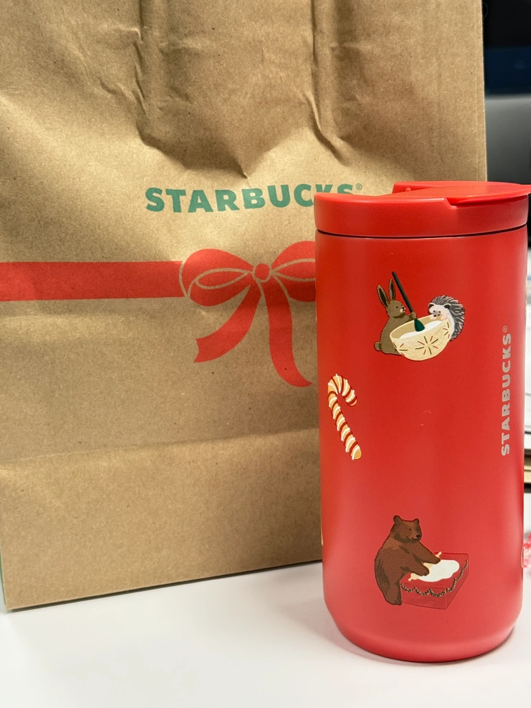 Selling a festive Starbucks red tumbler, perfect for the holiday season! It's adorned with cute winter-themed stickers and comes with a Starbucks gift bag. Great for keeping your drinks hot or cold on the go